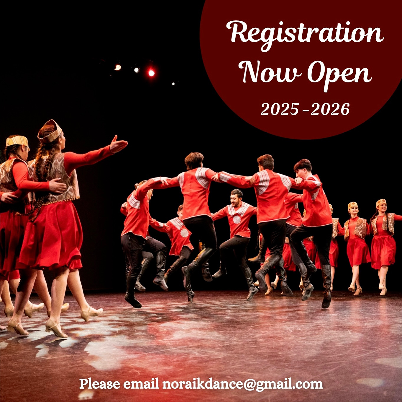 Interested in learning Armenian dance? Registration for the upcoming 2025-26 Noraik Dance season is now open! Please send us an email if you/your child is interested in learning more about enrolment. We accept girls ages 6 and up, as well as boys ages 7 and up. We also have classes for teens and young adults.